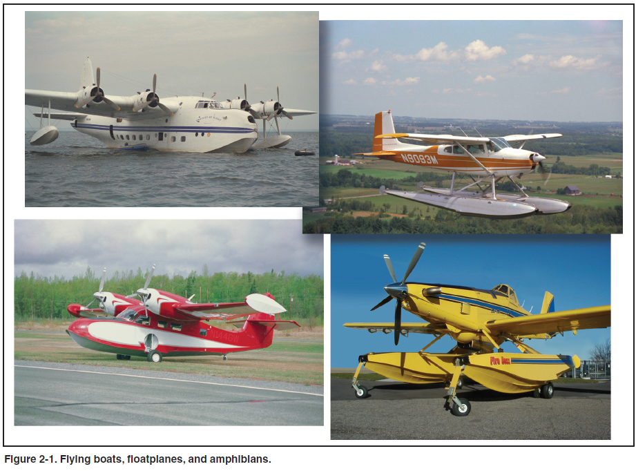 SEAPLANE CHARACTERISTICS There are two main types of seaplane: flying boats (often called hull seaplanes) and floatplanes. The bottom of a flying boat’s fuselage is its main landing gear. This is usually supplemented with smaller floats near the wingtips, called wing or tip floats. Some flying boats have sponsons, which are short, winglike projections from the sides of the hull near the waterline. Their purpose is to stabilize the hull from rolling motion when the flying boat is on the water, and they may also provide some aerodynamic lift in flight. Tip floats are sometimes known as sponsons. The hull of a flying boat holds the crew, passengers, and cargo; it has many features in common with the hull of a ship or boat. On the other hand, floatplanes typically are conventional landplanes that have been fitted with separate floats (sometimes called pontoons) in place of their wheels. The fuselage of a floatplane is supported well above the water’s surface. Some flying boats and floatplanes are equipped with retractable wheels for landing on dry land. These aircraft are called amphibians. On amphibious flying boats, the main wheels generally retract into the sides of the hull above the waterline. The main wheels for amphibious floats retract upward into the floats themselves, just behind the step. Additional training is suggested for anyone transitioning from straight floats to amphibious aircraft. [Figure 2-1]