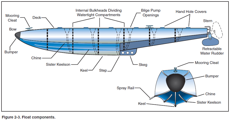 There are considerable differences between handling a floatplane and a flying boat on the water, but similar principles govern the procedures and techniques for both. This book primarily deals with floatplane operations, but with few exceptions, the explanations given here also apply to flying boats. A number of amphibious hull seaplanes have their engines mounted above the fuselage. These seaplanes have unique handling characteristics both on the water and in the air. Because the thrust line is well above the center of drag, these airplanes tend to nose down when power is applied and nose up as power is reduced. This response is the opposite of what pilots have come to expect in most other airplanes, and can lead to unexpected pitch changes and dangerous situations if the pilot is not thoroughly familiar with these characteristics. Pilots transitioning to a seaplane with this configuration should have additional training. Many of the terms that describe seaplane hulls and floats come directly from the nomenclature of boats and ships. Some of these terms may already be familiar, but they have specific meanings when applied to seaplanes. Figures 2-2 and 2-3 describe basic terms, and the glossary at the end of this book defines additional terms.