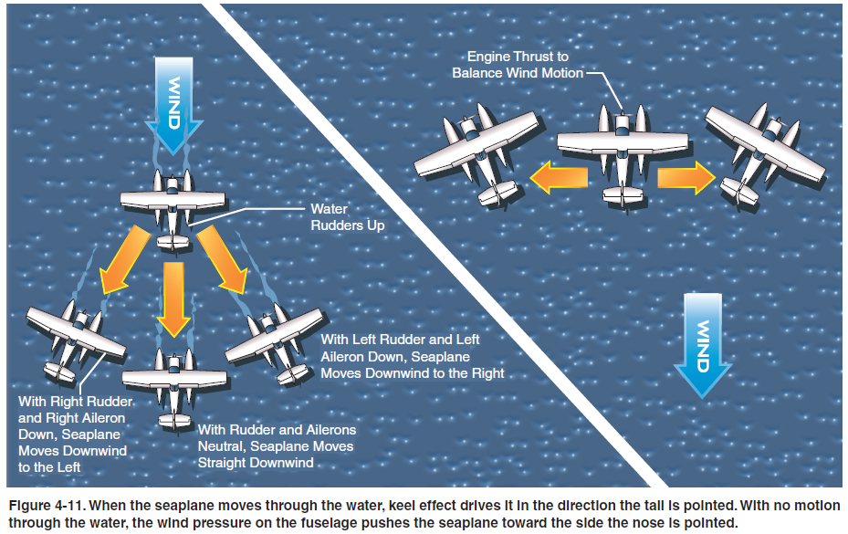 Where currents are a factor, such as in strong tidal flows or a fast flowing river, sailing techniques must incorporate the movement of the water along with the wind. The current may be a help or a hindrance, or change from a help to a hindrance when the pilot attempts to change direction. The keel effect only works when the floats are moving through the water. If the current is moving the seaplane, there may be little or no motion relative to the water, even though the seaplane is moving relative to the shore. Using wind, current, and thrust to track the desired course requires careful planning and a thorough understanding of the various forces at work. With the engine shut down, most flying boats sail backward and toward whichever side the nose is pointed, regardless of wind velocity, because the hull does not provide as much keel effect as floats in proportion to the side area of the seaplane above the waterline. To sail directly backward in a flying boat, release the controls and let the wind steer. Sailing is an essential part of seaplane operation. Since each type of seaplane has its own peculiarities, practice sailing until thoroughly familiar with that particular type. Practice in large bodies of water such as lakes or bays, but sufficiently close to a prominent object in order to evaluate performance. Before taxiing into a confined area, carefully evaluate the effects of the wind and current, otherwise the seaplane may be driven into obstructions. With a seaplane of average size and power at idle, a water current of 5 knots can offset a wind velocity of 25 knots in the opposite direction. This means that a 5 knot current will carry the seaplane against a 25 knot wind. Differential power can be used to aid steering in multiengine seaplanes.; |