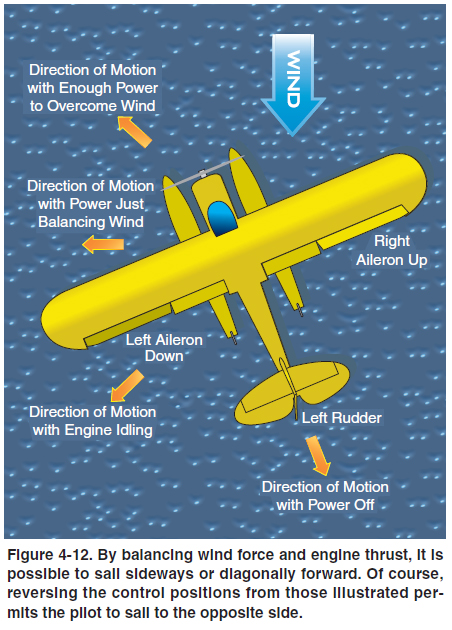 SAILING Landplane pilots are accustomed to taxiing by pointing the nose of the airplane in the desired direction and rolling forward. In seaplane operations, there are often occasions when it is easier and safer to move the seaplane backward or to one side because wind, water conditions, or limited space make it impractical to attempt a turn. If there is a significant wind, a seaplane can be guided into a space that might seem extremely cramped to an inexperienced pilot. Sailing is a method of guiding the seaplane on the water using the wind as the main motive force. It is a useful technique for maneuvering in situations where conventional taxiing is undesirable or impossible. Since the seaplane automatically aligns itself so the nose points into the wind, sailing in a seaplane usually means moving backward. In light wind conditions with the engine idling or off, a seaplane naturally weathervanes into the wind. If the pilot uses the air rudder to swing the tail a few degrees, the seaplane sails backward in the direction the tail is pointed. This is due to the keel effect of the floats, which tends to push the seaplane in the direction the sterns of the floats are pointing. In this situation, lift the water rudders, since their action is counter to what is desired. When sailing like this, the sterns of the floats have become the front, as far as the water is concerned, but the rear portions of the floats are smaller and therefore not as buoyant. If the wind is strong and speed starts to build up, the sterns of the floats could start to submerge and dig into the water. Combined with the lifting force of the wind over the wings, the seaplane could conceivably flip over backward, so use full forward elevator to keep the sterns of the floats up and the seaplane’s nose down. Adding power can also help keep the floats from submerging. If enough engine power is used to exactly cancel the backward motion caused by the wind, the seaplane is not moving relative to the water, so keel effect disappears. However, turning the fuselage a few degrees left or right provides a surface for the wind to push against, so the wind will drive the seaplane sideways in the direction the nose is pointed. Combining these techniques, a skilled pilot can sail a seaplane around obstacles and into confined docking spaces. [Figure 4-11]