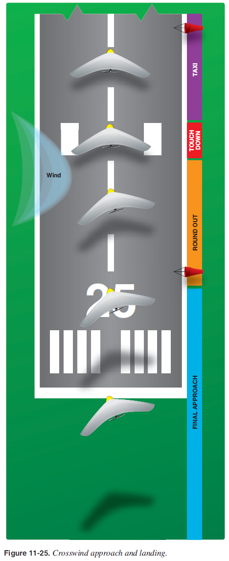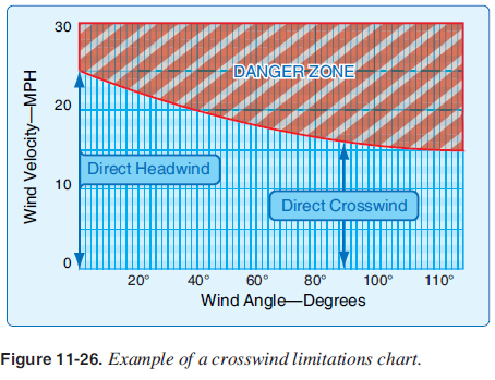 Takeoffs and landings in certain crosswind conditions are inadvisable and even dangerous. [Figure 11-26] If the crosswind is great enough, a hazardous landing condition may result. Therefore, takeoff and landing capabilities with respect to the reported surface wind conditions and available landing directions must be considered.