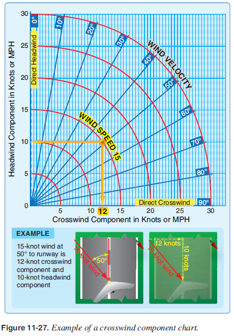WSC crosswind limitations have been tested and are included in the POH. The headwind and crosswind components for a given situation can be determined by reference to a crosswind component chart. [Figure 11-27] It is imperative that pilots determine the maximum crosswind component of each aircraft fl own and avoid operations in wind conditions that exceed the capability of the aircraft. The automatic weather observation system (AWOS) or automatic surface observation system (ASOS) at airports is useful in determining the measured velocity for this evaluation.