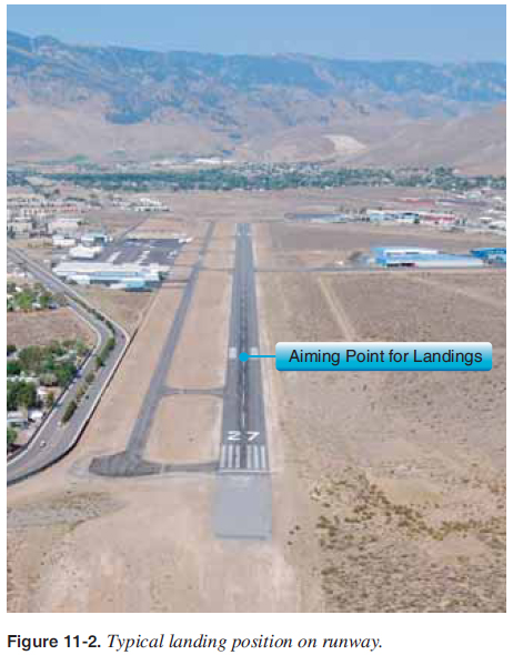The descent angle should be controlled throughout the approach so that the aircraft lands in the center of the runway at the aiming point, as discussed earlier. The descent angle is affected by all four fundamental forces that act on an aircraft (lift, drag, thrust, and weight). If all the forces are constant, the descent angle is constant in calm air. The pilot can control these forces by adjusting the airspeed and power. The fi nal approach sequence is shown in Figures 11-4 through 11-8.