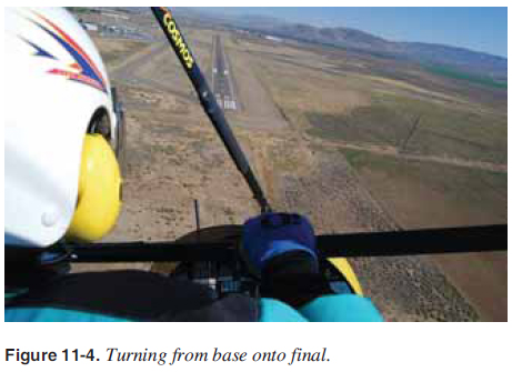 The base leg should be continued to the point where a medium- to shallow-banked turn aligns the aircraft’s path directly with the centerline of the landing runway. This descending turn should be completed at a safe altitude that is dependent upon the height of the terrain and any obstructions along the ground track. The turn to the fi nal approach should also be suffi ciently above the airport elevation to permit a fi nal approach long enough for the pilot to accurately estimate the resultant point of touchdown, while maintaining the proper approach airspeed. This requires careful planning for the starting point and radius of the turn. [Figure 11-3] Normally, it is recommended that the angle of bank not exceed a medium bank because the steeper the angle of bank, the higher the airspeed at which the aircraft stalls. Since the base-to-fi nal turn is made at a relatively low altitude, it is important that a stall not occur at this point. If an extremely steep bank is needed to prevent overshooting the proper fi nal approach path, it is advisable to discontinue the approach, go around, and plan to start the turn earlier on the next approach rather than risk a hazardous situation.