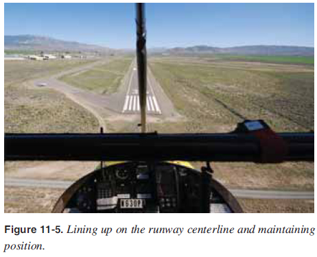 The base leg should be started at a point where the power can be brought back to idle and the WSC aircraft can glide to the landing spot at the approach speed recommended by the manufacturer. The intended landing point should not be at the end of the runway on a threshold or numbers, but beyond at the landing lines. [Figure 11-2] This provides some margin if the landing is shorter than anticipated. For smaller runways that do not have these markings, establish an appropriate landing point beyond the start of the runway, allowing plenty of room for the after-landing roll. At much larger airports, the landing can be done farther down the runway or at a location where the pilot can taxi off the runway and not delay other air traffi c behind the aircraft.