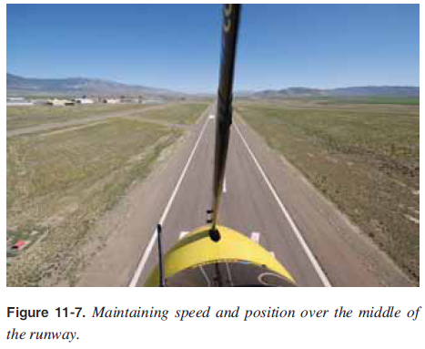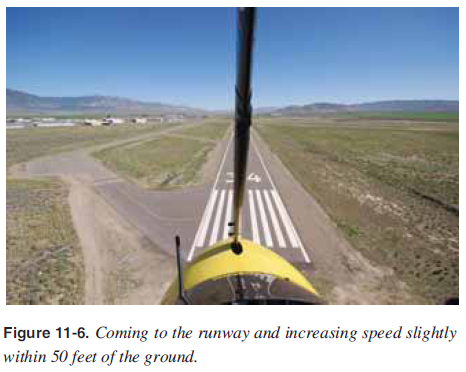 Additionally, this is a lower energy approach and may be slower than the manufacturer’s safe approach speed. The proper angle of descent to the runway must be maintained at the minimum speed recommended by the manufacturer, with a fl atter descent angle obtained with increases in power as required. Steeper descent angles are obtained with headwinds or the pilot increasing speed/decreasing the angle of attack, both of which are covered later in this chapter.