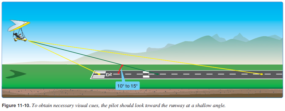 During the roundout, the airspeed is decreased to touchdown speed while the lift is controlled so the aircraft settles gently onto the landing surface. The roundout should be executed at a rate at which the proper landing attitude and the proper touchdown airspeed are attained simultaneously just as the wheels contact the landing surface. The rate at which the roundout is executed depends on the aircraft’s height above the ground, the rate of descent, and the airspeed. A roundout started excessively high must be executed more slowly than one from a lower height to allow the aircraft to descend to the ground while the proper landing attitude is being established. The rate of rounding out must also be proportionate to the rate of closure with the ground. When the aircraft appears to be descending very slowly, the increase in pitch attitude (slowing of the WSC) must be made at a correspondingly low rate. Visual cues are important in roundout at the proper altitude and maintaining the wheels a few inches above the runway until eventual touchdown. Roundout cues are dependent primarily on the angle at which the pilot’s central vision intersects the ground (or runway) ahead and slightly to the side. Proper depth perception is a factor in a successful roundout, but the visual cues used most are those related to changes in runway or terrain perspective and to changes in the size of familiar objects near the landing area such as fences, bushes, trees, hangars, and even sod or runway texture. The pilot should direct central vision at a shallow downward angle of 10° to 15° toward the runway as the roundout is initiated. [Figure 11-10]