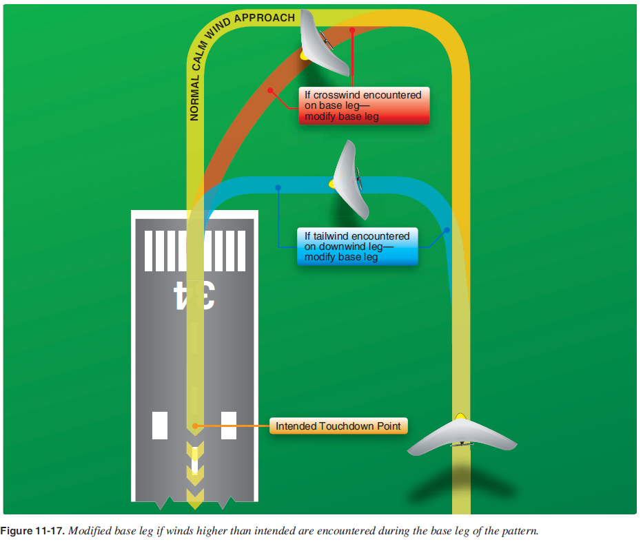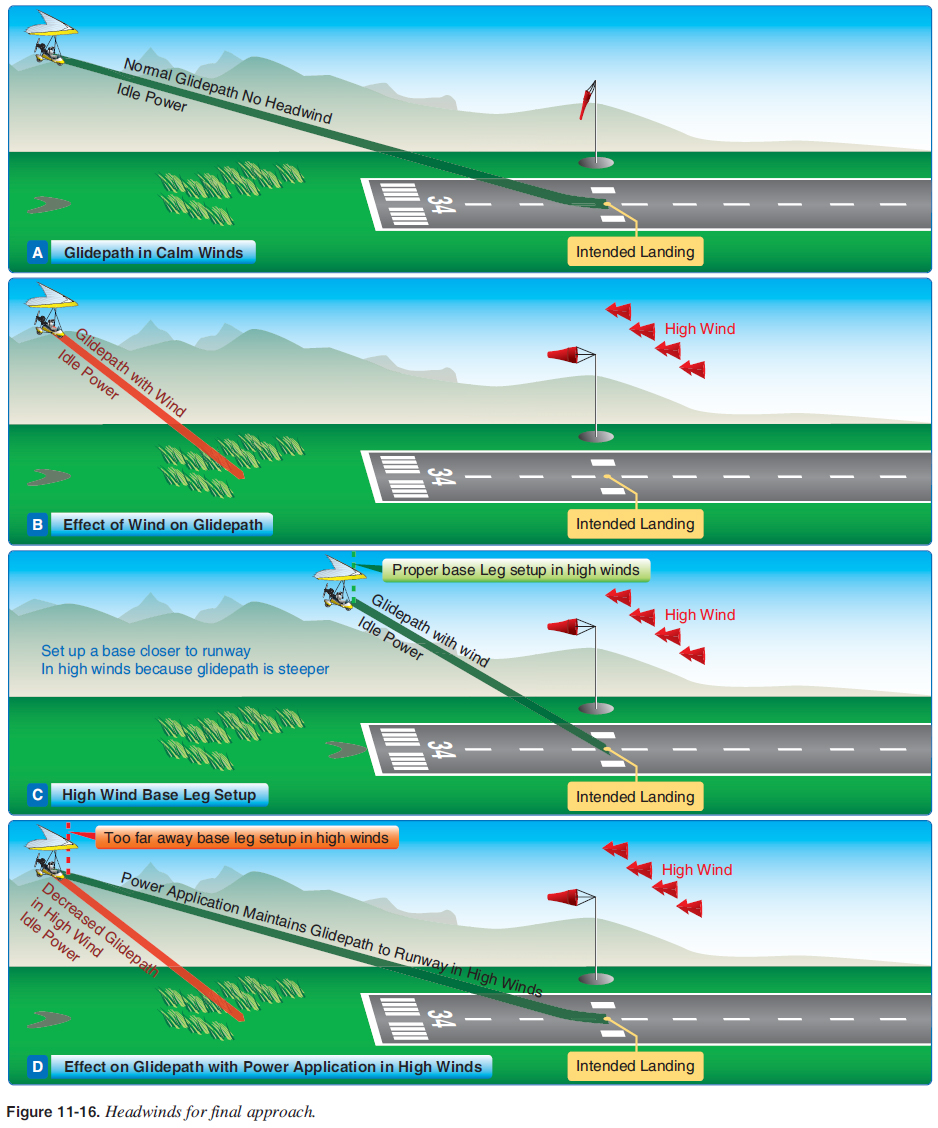 Effect of Headwinds During Final Approach A headwind plays a prominent role in the gliding distance over the ground. Strong headwinds decrease the glide as shown in the comparison in Figure 11-16A with no wind normal glide versus Figure 11-16B in headwind with steeper glide. To account for a steeper glide in a headwind, the base leg must be positioned closer to the approach end of the runway than would be required with a light wind. Therefore,