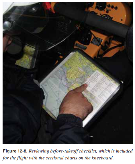Preparation and Prefl ight Night fl ying requires that pilots be aware of and operate within their abilities and limitations. Although careful planning of any fl ight is essential, night fl ying demands more attention to the details of prefl ight preparation and planning. Preparation for a night fl ight should include a thorough review of the available weather reports and forecasts with particular attention given to temperature-dew point spread. A narrow temperature-dew point spread may indicate the possibility of ground fog. Emphasis should also be placed on wind direction and speed, since wind effects on the aircraft cannot be as easily detected at night as during the day. On night cross-country fl ights, appropriate aeronautical charts should be selected, including the appropriate adjacent charts. Course lines should be drawn in black to be more distinguishable. Prominently lighted checkpoints along the prepared course should be noted. Rotating beacons at airports, lighted obstructions, lights of cities or towns, and lights from major highway traffi c all provide excellent visual checkpoints. The use of a GPS with a lighted screen adds signifi cantly to the safety and effi ciency of night fl ying. All personal equipment should be checked prior to fl ight to ensure proper functioning. It is very disconcerting to fi nd at the time of need that a fl ashlight does not work. All aircraft lights should be turned on momentarily and checked for operation. Position lights can be checked for loose connections by tapping the light fi xture. If the lights blink while being tapped, further investigation to determine the cause should be made prior to fl ight. The parking ramp should be examined prior to entering the aircraft. During the day, it is quite easy to see stepladders, chuckholes, wheel chocks, and other obstructions, but at night it is more diffi cult. A check of the area can prevent taxiing mishaps. Starting, Taxiing, and Runup After the pilot is seated in the fl ight deck and prior to starting the engine, all items and materials to be used on the fl ight should be arranged in such a manner that they will be readily available and convenient to use. Extra caution should be taken at night to assure the propeller area is clear. Turning the rotating beacon on or fl ashing the aircraft position lights serves to alert persons nearby to remain clear of the propeller. To avoid excessive drain of electrical current from the battery, it is recommended that unnecessary electrical equipment be turned off until after the engine has been started. After starting and before taxiing, the taxi or landing light should be turned on. Continuous use of the landing light with revolutions per minute (rpm) power settings normally used for taxiing may place an excessive drain on the aircraft’s electrical system. Also, overheating of the landing light could become a problem because of inadequate airfl ow to carry the heat away. Landing lights should be used as necessary while taxiing. When using landing lights, consideration should be given to not blinding other pilots. Taxi slowly, particularly in congested areas. If taxi lines are painted on the ramp or taxiway, these lines should be followed to ensure a proper path along the route. The before takeoff and runup should be performed using the checklist. During the day, forward movement of the aircraft can be detected easily. At night, the aircraft could creep forward without being noticed unless the pilot is alert for this possibility. Hold or lock the brakes during the runup and be alert for any forward movement. [Figure 12-8]