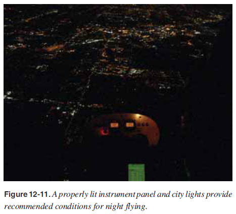 The darkness of night often makes it diffi cult to note whether the airborne aircraft is getting closer to or farther from the surface. To ensure the aircraft continues in a positive climb, be sure a climb is indicated on the attitude indicator (if equipped), vertical speed indicator (VSI), and altimeter. It is also important to ensure the airspeed is at best climb speed. Necessary pitch and bank adjustments should be made by referencing the attitude, heading, or ground track indicators. Heading indicators include both the aircraft heading indicators and the magnetic compass. Once the aircraft starts moving and establishing a ground track straight down the runway, the GPS has data points to establish a ground track and becomes useful once in fl ight. It is recommended that turns not be made until reaching a safe maneuvering altitude. Although the use of the landing lights provides help during the takeoff, they become ineffective soon after liftoff when the aircraft has climbed to an altitude at which the light beam no longer extends to the surface. The light can cause distortion when it is refl ected by haze, smoke, or fog that might exist in the climb. Therefore, when the landing light is used for the takeoff, it may be turned off after the climb is well established provided other traffi c in the area does not require its use for collision avoidance. A properly lit instrument panel and visual reference to the ground with city lights are recommended for night fl ying. [Figure 12-11]