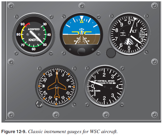Takeoff and Climb Night fl ying is very different from day fl ying and demands more attention of the pilot. The most noticeable difference is the limited availability of outside visual references. Therefore, fl ight instruments should be used as a reference in controlling the aircraft. This is particularly true on night takeoffs and climbs. The fl ight deck lights should be adjusted to a minimum brightness that allows the pilot to read the instruments and switches but not hinder the pilot’s outside vision. This also eliminates light refl ections on the windshield and instruments. After ensuring that the fi nal approach and runway are clear of other air traffi c, or when cleared for takeoff by the tower, the landing lights and taxi lights should be turned on and the WSC aircraft lined up with the centerline of the runway. If the runway does not have centerline lighting, use the painted centerline and the runway edge lights. After the aircraft is aligned, the heading indicator should be noted or set to correspond to the known runway direction. The magnetic compass should read the exact direction of the runway. The GPS does not provide meaningful information while stopped or turning because it measures ground track and needs to be moving to register enough points to provide accurate data. To begin the takeoff, the brakes should be released and the throttle smoothly advanced to maximum allowable power. As the aircraft accelerates, it should be kept moving straight ahead between and parallel to the runway-edge lights. The procedure for night takeoffs is the same as for normal daytime takeoffs except that many of the runway visual cues are not available. Therefore, the airspeed fl ight instrument can be checked during the takeoff roll to ensure the proper airspeed in being obtained. As the airspeed reaches the normal lift-off speed, the pitch attitude should be adjusted to that which establishes a normal climb. This should be accomplished by using the normal control bar position for the desired climb speed. After liftoff, instruments can be checked for proper heading, and airspeed. [Figures 12-9 and 12-10]