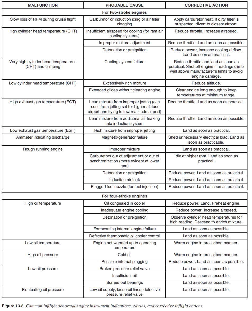 The AFM/POH for the specifi c aircraft contains information that should be followed in the event of any abnormal engine instrument indications. The table in Figure 13-8 offers generic information on some of the more commonly experienced infl ight abnormal engine instrument indications, their possible causes, and corrective actions. It is important to know that when an engine temperature probe fails, it usually reads an unusually low value, zero, or does not register. This should be taken into account when evaluating the situation with engine instruments.