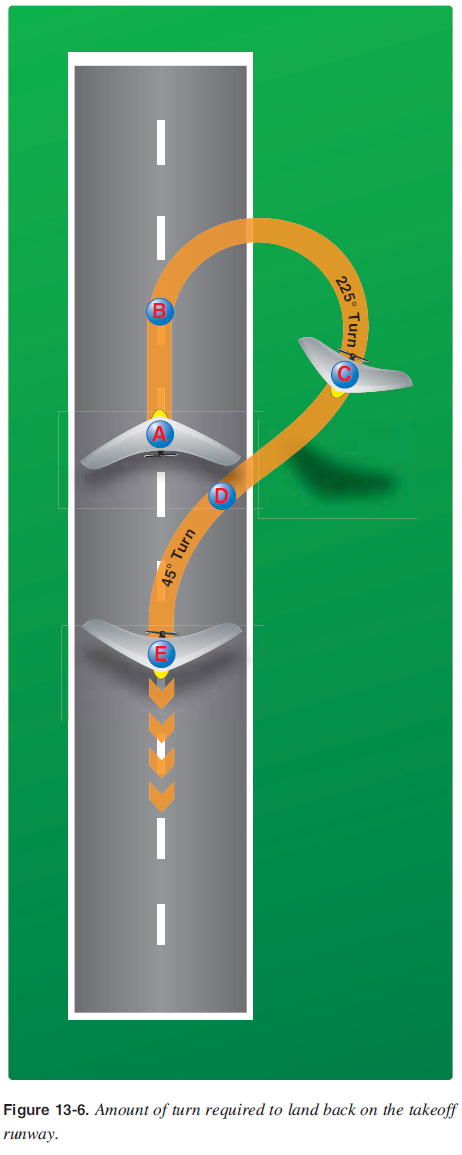 Engine Failure After Takeoff As discussed earlier in Chapter 7, Takeoff and Departure Climbs, proper takeoff technique provides lower pitch angles during the initial climb to provide the slowest possible descent rate for an engine failure after takeoff. The pitch angle and altitude available for engine failure at takeoff are the controlling factors in the successful accomplishment of an emergency landing. If an actual engine failure should occur immediately after takeoff and before a safe maneuvering altitude is attained, it is usually inadvisable to attempt to turn back to the takeoff fi eld. Instead, it is safer to establish the proper glide attitude immediately, and select a fi eld directly ahead or slightly to either side of the takeoff path. The decision to continue straight ahead is often diffi cult to make unless the problems involved in attempting to turn back are seriously considered. First, the takeoff was probably made into the wind. To return to the takeoff fi eld, a downwind turn must be made. This increases the groundspeed and rushes the pilot even more in the performance of procedures and in planning the landing approach. Second, the aircraft loses considerable altitude during the turn and might still be in a bank when the ground is contacted, resulting in cartwheeling (a catastrophe for the occupants, as well as the aircraft). After turning downwind, the apparent increase in groundspeed could mislead the pilot into a premature attempt to slow the aircraft to a stall. Finally, it is more than one 180° turn. For example, it is fi rst a 225° turn in one direction, then another 45° turn in the other direction, totaling 310° of turn. [Figure 13-6]