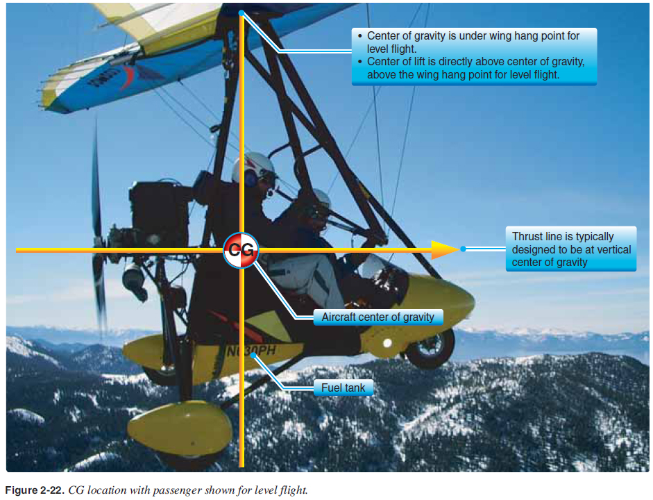 For level fl ight, the CG is directly below the wing/carriage attachment point known as the hang point, and the propeller thrust line is typically designed to be near the vertical position of the CG. [Figure 2-22]