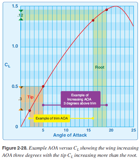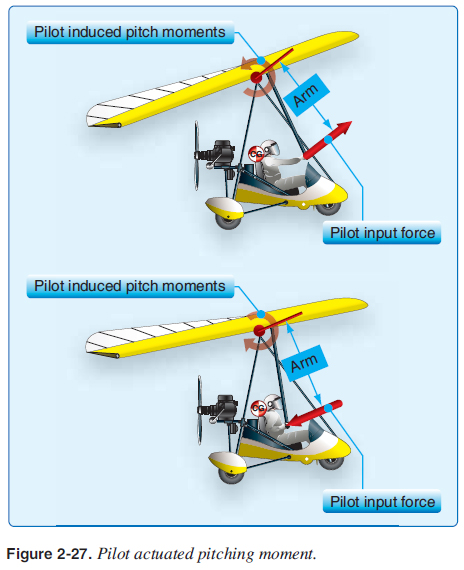 CHAPTER 2. Aerodynamics Low Angles of Attack At very low AOA, the tip chords are near zero AOA or below, not producing any lift, as shown in Figure 2-25C. At this point, the nose area is producing all of the lift for the wing. The CLW moves forward a distance “c,” creating a positive stabilizing moment to raise the nose. Pitch Pressures As the pilot pushes out on the control bar, this creates a pilot input force that has a moment arm from the control bar up to the wing hang point. [Figure 2-27] ![]() From this pilot-induced pitch moment, the control bar is pushed out, the nose raised, and the AOA increases an equal amount for both the root and the tip chords. However, as shown in Figures 2-26 and 2-28, the average CL change is greater at the low AOA at the tip chords, while the amount of change of the CL is much less at higher AOA at the root chord. Therefore, an increase in AOA for the wing results in the tips creating a greater proportion of the lift and moving the center of lift behind the CG, creating a negative pitching moment to lower the nose at high AOA. ![]() Based on the same principle, when the wing AOA is lowered below the trim position, the tip chords’ CL decreases more than the root chord and the center of lift for the wing moves forward creating a positive moment to raise the nose at lower AOA. In situations where the pilot is fl ying in severe/extreme turbulence, wind sheer, or the pilot is exceeding the limitations of the aircraft, the WSC aircraft can get into a situation where the root chord is at a negative AOA and not producing lift. This could result in an emergency vertical dive situation, as discussed later in the Whip Stall-Tuck-Tumble section. When at very low angles or negative angles of attack, the WSC wing is designed so that the wing has positive stability or a noseup aerodynamic moment. This is accomplished by a number of different systems (washout struts, sprogs and refl ex lines) further explained in chapter 3 that simply keep the trailing edge of the wing up in an emergency low/negative AOA dive situation. As shown in Figure 2-29, the root area of the wing has refl ex which creates a positive pitching moment for the root chord to rotate the nose up towards a level fl ying attitude. At the same time, the tips are at a negative AOA producing lift in the opposite direction as usual, creating a moment to bring the nose/root chord up to a positive AOA to start producing lift and raising the nose to a normal fl ight condition. The negative lift or downward force as produced at the tips and root as shown provide a positive moment to raise the nose back to a normal fl ying attitude. ![]() Refl ex also provides a stable pitch up moment for an airfoil when it is fl ying at normal fl ight angles of attack. The greater the refl ex, the greater the nose up moment of the airfoil. This is used in some WSC airfoil designs and also for trim control as discussed in Chapter 3. Carriage Moments The wing design is the main contributing factor for pitch stability and moments, but the carriage design can also infl uence the pitching moment of the WSC aircraft. For example, at very high speeds in a dive, a streamlined carriage would have less drag and, therefore, a greater nose-up moment because of less drag. The design of the carriage parts can have an effect on aerodynamic forces on the carriage, resulting in different moments for different carriage designs. The drag of the wing in combination with the drag of the carriage at various airspeeds provides a number of pitching moments, which are tested by the manufacturer—a reason the carriage is matched to the wing for compatibility. Each manufacturer designs the carriage to match the wing and takes into account these unique factors. Pitch Moments Summary Overall, the amount of sweep, twist, specifi c airfoil design from root to the tip, and the carriage design determine the pitching moments of the WSC aircraft. Some have small pitching moments, some have greater pitching moments. Each WSC model is different with a balance of these aerodynamic parameters to accomplish the specifi c mission for each unique carriage and wing combination. |