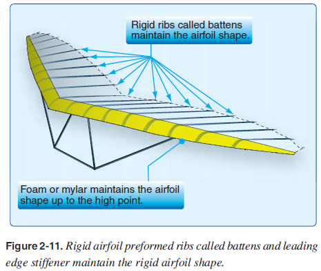 The WSC wing retains its rigid airfoil shape due to rigid preformed ribs called battens, which are inserted from the root to the tip along the span of the wing (similar to ribs for an airplane wing) and a piece of foam or mylar running along the top side of the leading edge to the high point, which maintains its front part of the airfoil shape in between the battens. [Figure 2-11]