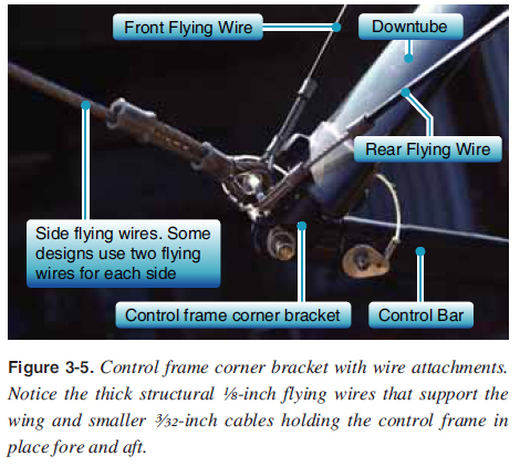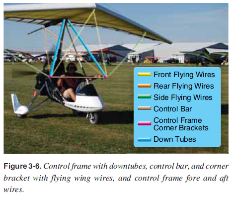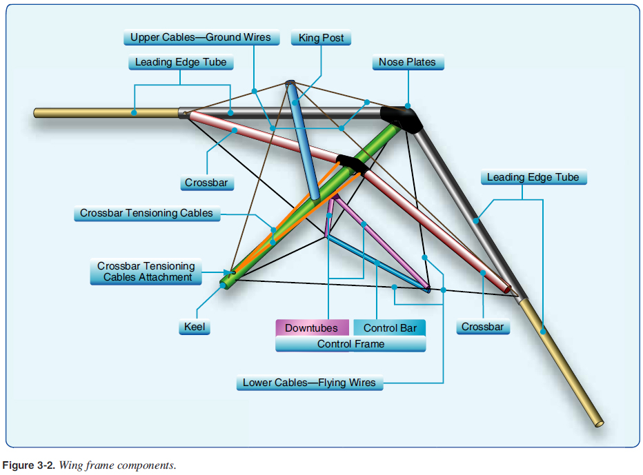 Crossbar The crossbar is two aluminum tube sections hinged above the keel that attach to the leading edges. The crossbar is tensioned back with the crossbar tensioning cables, which pushes the leading edges forward to conform to the sail. These crossbar tensioning cables are attached at the rear of the keel when the wing is tensioned into fl ying position. [Figure 3-4] ![]() These crossbar sections are under a compression load and designed to be stiff with no bending. A larger diameter tube is typically used to avoid any bending when the wing is fl ying. A ding, dent, or bend in the crossbar could spell disaster during fl ight because it is one of the main structural members that holds leading edges into position during fl ight. For wing take down and packing, the crossbar haul back cables are released, the crossbar hinged center moves forward, and the leading edges rotate in toward the keel about the nose plates and come together, allowing the wing to fold down into a long tube for transport and/or storage. Control Frame The triangle-shaped control frame serves two main purposes. It provides the lower structure for the wing and is the control bar for the pilot. The control frame is bolted to the keel with two downtubes extending from the keel attachment to the horizontal base tube, which is the pilot’s control bar. [Figures 3-2, 3-5, and 3-6] ![]() ![]() ![]() Control frame corner brackets at the bottom of the downtubes provide the wing structural attachments for the fl ying cables or struts that attach to each leading edge/crossbar junction, and secure the control bar fore and aft to the wing with the front and back wires attached to nose plates and the aft section of the keel. [Figures 3-5 and 3-6] During fl ight, the downtubes are similar in compression to the crossbar and must be stiff and straight to maintain structural integrity. The base tube/control bar is under tension during fl ight. Front and rear fl ying wires hold the control frame in place fore and aft. Side fl ying wires hold the control frame in place side to side and provide structure to hold the wings in place while fl ying. [Figures 3-2, 3-5, and 3-6] Strutted wings use struts in place of the side fl ying wires, which is discussed later in this chapter. Training bars are added for dual controls so the person in back can fl y the aircraft. These are typically used by an instructor for training but can be used by a passenger in the back also. [Figure 3-7] ![]() |
