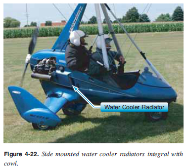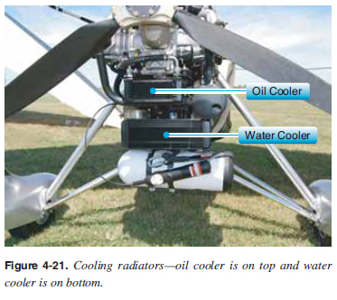 Four-stroke engines use either a wet sump or dry sump oil system. Refer to the Pilot’s Handbook of Aeronautical Knowledge for more information on four-stroke oil systems. Engine Cooling Systems The burning fuel within the cylinders produces intense heat, most of which is expelled through the exhaust system. Much of the remaining heat, however, must be removed, or at least dissipated, to prevent the engine from overheating. While the oil system in a four-stroke engine and the fuel-oil mix in a two-stroke engine is vital to the internal cooling of the engine, an additional method of cooling is necessary for the engine’s external surface. WSC engines operate with either air-cooled or liquid-cooled systems. Many WSC aircraft are equipped with a cylinder head temperature (CHT) gauge. This instrument indicates a direct and immediate cylinder temperature change. This instrument is calibrated in degrees Celsius or Fahrenheit. Proper CHT ranges can be found in the POH/AFM/AOI for that machine. [Figure 4-20] ![]() Air cooling is accomplished by air being pulled into the engine shroud by a cooling fan. Baffl es route this air over fi ns attached to the engine cylinders where the air absorbs the engine heat. Expulsion of the hot air takes place through one or more openings in the shroud. If cylinder head temperatures rise too much in an air-cooled engine, it is because of lubrication problems, cooling fan drive belt damage or wear, Liquid cooling systems pump coolant through jackets in the cylinders and head. The heated liquid is then routed to a radiator where the heat is radiated to the atmosphere. The cooled liquid is then returned to the engine. If the radiator is mounted close to the propeller, the propeller can constantly move air across the radiator and keep the engine cool even when the WSC is not moving. [Figure 4-21] Radiators mounted away from the propeller make it more diffi cult for the radiator to cool the engine unless the WSC is moving. [Figure 4-22] ![]() ![]() Breaking in an engine through ground runs on a hot day is when radiator placement is most critical. Liquid-cooled engines can overheat for a number of reasons, such as coolant not at proper levels, a leak, failed water pump, or a blockage of the radiator. Operating an engine above its maximum design temperature can cause a loss of power and detonation. It will also lead to serious permanent damage, such as scoring the cylinder walls and damaging the pistons and rings. Monitor the engine temperature instruments to avoid high operating temperature. Operating the engine lower than its designed temperature range can cause piston seizure and scarring on the cylinder walls. This happens most often in liquid-cooled WSC aircraft in cold weather where large radiators designed for summer fl ying may need to be partially blocked off. |