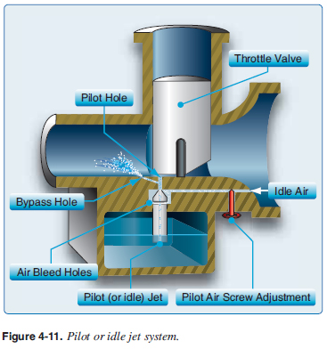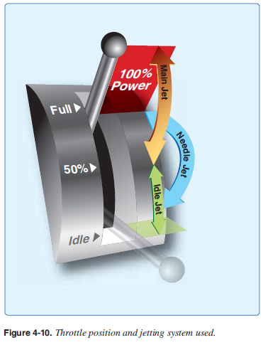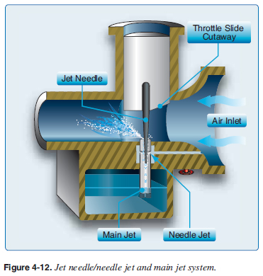 Carburetor Systems WSC aircraft use fl oat-type carburetors. The “fl oat-type carburetor” acquires its name from a fl oat that rests on fuel within the carburetor fl oat chamber, commonly known as the fuel bowls. The fl oat maintains the fuel level in the fuel bowls. As fuel is used by the engine, the fuel and fl oat levels drop, opening the valve letting more fuel into the fuel bowls until the proper level of fuel in the fuel bowls is achieved and the valve is closed. Reference the Pilot’s Handbook of Aeronautical Knowledge for basic information on fl oat carburetor operation. Modern two- and four-stroke carburetors operate with three separate jetting systems depending on engine power. [Figure 4-10] ![]() When the throttle is closed for engine idling, the throttle valve is closed and the fuel/air mixture is supplied through the idle (pilot) jet and idle (pilot) air passage. The fuel/air mixture is supplied to the cylinders through the bypass hole. [Figure 4-11] ![]() As the throttle is advanced and the throttle valve is raised, the fuel is sucked up through the main jet but is controlled by the opening and taper of the jet needle and needle jet. This is effective throughout most of the midrange operation. About half throttle, the main jet size starts to infl uence the amount of fuel mixed with the air and this effect continues until it is the main infl uence at the highest throttle settings. [Figures 4-10 and 4-12] ![]() |