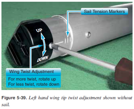 Batten tension is one way of fixing very mild turns. Increasing the batten tension at the tips especially decreases twist and raises the wing. For normal mild turns, most wings have an adjustment at the tip where you can rotate the wing tip around the leading edge. This is the easiest and most effective wing twist adjustment. [Figure 5-39] For some models, reflex at the root can be adjusted on a side to adjust a significant turn. More reflex on a side means wing up, similar to reducing twist in a wing. As emphasized above, the POH for each manufacturer must be used for adjusting twist for wing tuning.