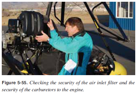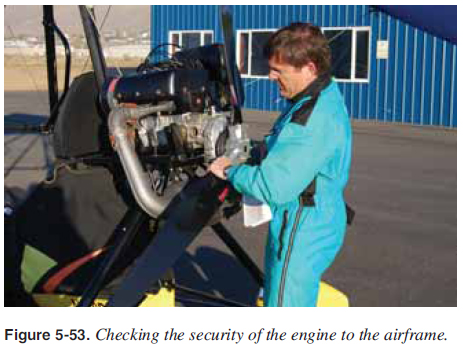 Inspect engine attachment to the carriage for security and cracks. In addition to looking at the bolts and mounts, shake the propeller, as shown in Figure 5-53, to provide a secure check of the propeller, gearbox, engine, and engine attachment to the carriage.