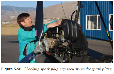 • Inspect spark plug caps and wires to CDI units to ensure they are secure and fastened. [Figure 5-56]