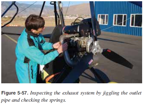 Cooling Systems Ensure there is clear airfl ow for any cooling system fan or radiator. Ensure no insects or birds created an obstruction to the airfl ow for the engine cooling system. Air cooled—rotate the propeller and ensure that the cooling fan rotates also. Water cooled—check the coolant level to ensure there is cooling fl uid in the system. Four stroke with additional oil coolers—ensure the oil cooler has clear airfl ow and that nothing is blocking it. Exhaust Systems Inspect exhaust attachment to engine, and EGT senders. Slightly jiggle the exhaust system to inspect the springs holding it together. All springs must be secure. Inspect the condition of exhaust system for cracks and attachment security. [Figure 5-57] ![]() Propeller Gearbox Rotate the propeller in the proper direction only and inspect blades for cracks or nicks. Listen and feel for smooth operation and engine compression while rotating the propeller. Inspect propeller attachment to the gearbox and the gearbox attachment to the engine. Throttle System Check all throttle controls for smooth operation and proper travel and locking. Also check choke and/or primer system for proper operation and travel. Flight Deck Inspection The following should be performed for a flight deck inspection: