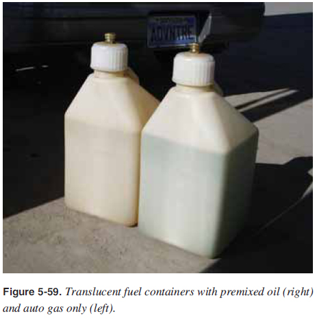![]() Fuel Overall, particular attention should be paid to the fuel quantity, type/grade, and quality. Modern WSC two- and four-stroke engines are designed to use auto gas with various octane ratings as specifi ed by the manufacturer for different models. If auto gas is stored for more than 3 weeks, octane value may fall below the recommended rating. In this situation, it is best to drain the gas and use fresh gas. For engines designed for auto gas, aviation gasoline (AVGAS) 100LL can be mixed and used on a limited basis but the lead in this is not good for the engine and additional precautions/procedures should be researched for the particular make/model of engine for primary use. Always use a higher grade/octane of fuel rather than a lower grade, or detonation will severely damage the engine in a very short period of time. Check the aircraft operation manual and the engine manual for the type of fuel to use. When attempting to fuel for maximum capacity, remember that many fuel tanks are very sensitive to attitude. Fill the aircraft on a level surface and check to ensure the amount of fuel in the tanks is adequate for the planned fl ight plus 30 minutes of reserve. Check the level in the fuel tank plus the panel-mounted gauge, if so equipped. To transport gasoline, clear gas cans are preferable because the fuel is visible through the container and allows a pilot to look at the container for fuel level. [Figure 5-59] ![]() An important step in any prefl ight is to check for water and other sediment contamination. Avgas is more probable to have water in the fuel tanks because auto gas typically has alcohol in it to boost the octane. Alcohol absorbs water, running it harmlessly through the system. When using 100LL Avgas, water tends to accumulate in fuel tanks from condensation, particularly in partially fi lled tanks. Because water is heavier than fuel, it tends to collect in the low points of the fuel system. If Avgas is used, drain any water from the low point in the system. |