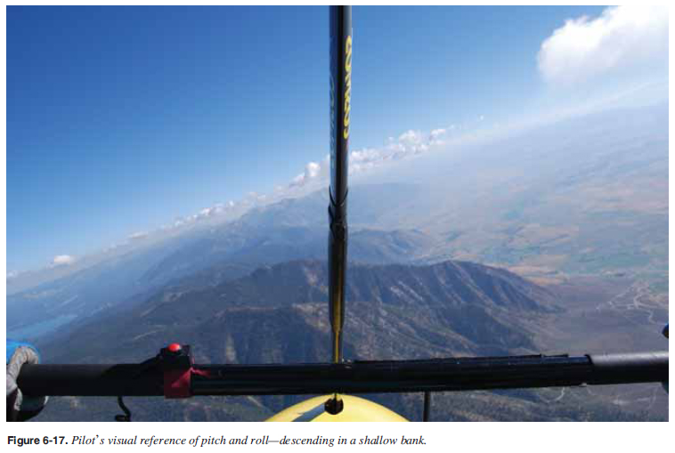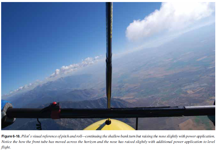 Gliding Turns Gliding turns have a signifi cant increase in descent rate than straight glides because of the decrease in effective lift due to the direction of the lifting force being at an angle to the pull of gravity. Therefore, it should be clearly understood that the steeper the bank angle, the greater the descent rate. In gliding turns, the decrease in effective lift due to the direction of the lifting force being at an angle to the pull of gravity make it necessary to use more nose-up pressure than is required for a straight glide. However, as discussed earlier for steeper turns, airspeed must be maintained well above stall speed which increases during turns or the WSC could stall in the turn. When recovery is being made from a medium or high banked gliding turn, the pitch force which was applied during the turn must be decreased back to trim, which must be coordinated with the roll back to level. In order to maintain the most effi cient or normal glide in a turn, more altitude must be sacrifi ced than in a straight glide since this is the only way speed can be maintained without power. Attention to the front tube angle with the horizon and the reference point on the front tube provide visual reference of attitudes while gliding. [Figures 6-17 and 6-18]