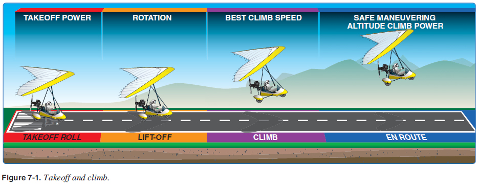 Terms and Defi nitions Although the takeoff and climb is one continuous maneuver, it is divided into three separate steps for purposes of explanation: takeoff roll, lift-off, and initial climb after becoming airborne. [Figure 7-1]