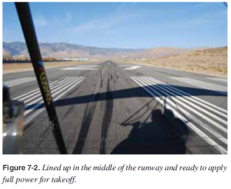 After taxiing onto the runway, the WSC aircraft should be carefully aligned with the intended takeoff direction and the nosewheel positioned straight down the runway on the centerline. After releasing the brakes, the throttle should be advanced smoothly and continuously to takeoff power. [Figure 7-2] This can be done with the foot or the hand cruise throttle.