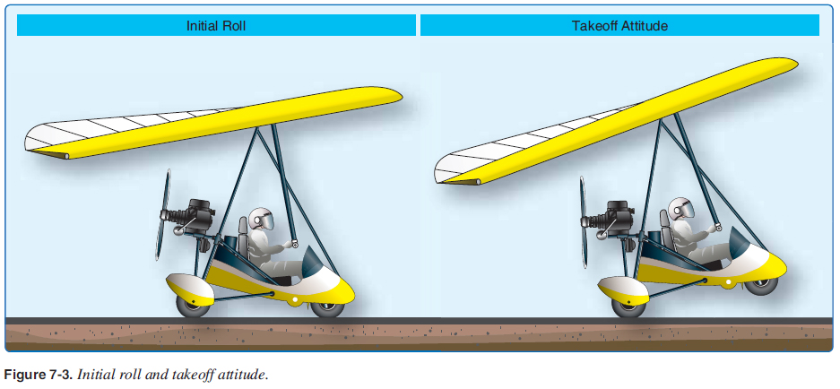Since a good takeoff depends on the proper takeoff attitude, it is important to know how this attitude appears and how it is attained. The ideal takeoff attitude requires only minimum pitch adjustments shortly after the airplane lifts off to attain the speed for the best rate of climb (VY). [Figure 7-3] The pitch attitude necessary for the aircraft to accelerate to VY speed should be demonstrated by the instructor and memorized by the student. Initially, the student pilot may have a tendency to hold excessive control bar forward/nose up pressure just after lift-off, resulting in an abrupt pitch-up. The fl ight instructor should be prepared for this. For a normal takeoff, the WSC aircraft should lift off the ground gradually and smoothly.