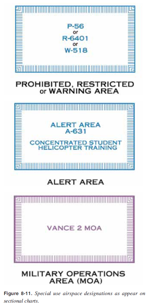 Except for controlled firing areas, special use airspace areas are depicted on visual sectional charts. [Figure 8-11] Controlled fi ring areas are not charted because their activities are suspended immediately when spotter aircraft, radar, or ground lookout positions indicate an aircraft might be approaching the area. Nonparticipating aircraft are not required to change their fl ightpaths. Special use airspace areas are shown in their entirety (within the limits of the chart), even when they overlap, adjoin, or when an area is designated within another area. The areas are identifi ed by type and identifying name or number, positioned either within or immediately adjacent to the area. [Figure 8-11]