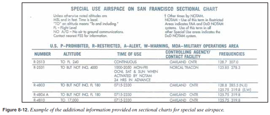 Prohibited, restricted or warning areas; alert areas; and MOAs are further defi ned with tables on sectional charts for their altitudes, time of use, controlling agency/contact facility and controlling agency contact frequency. [Figure 8-12]