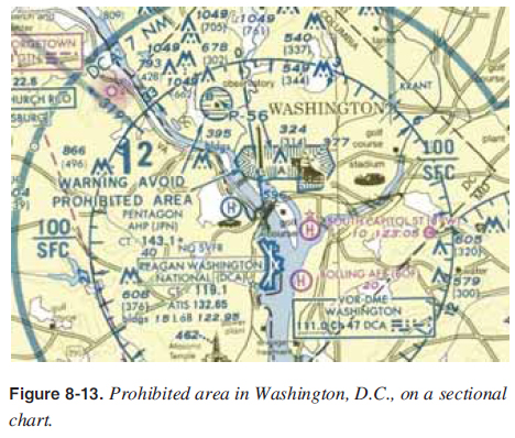 Prohibited areas contain airspace of defi ned dimensions within which the fl ight of aircraft is prohibited. Such areas are established for security or other reasons associated with the national welfare. These areas are published in the Federal Register and are depicted on sectional charts. The area is charted as a “P” followed by a number (e.g., “P-56 A and B”). [Figure 8-13]