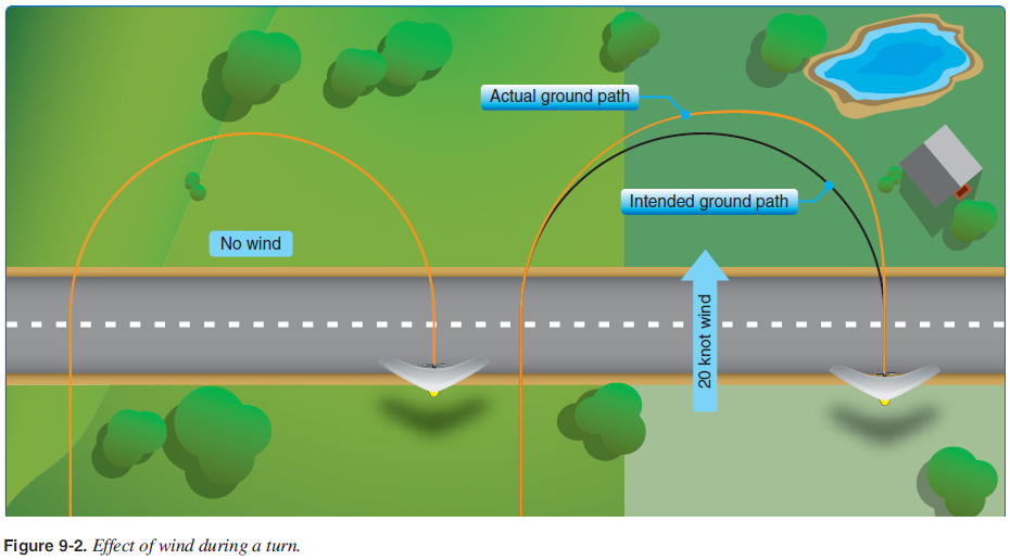 A similar 360° turn may be started at a specifi c point over the reference line, with the aircraft headed directly downwind. In this demonstration, the effect of wind during the constant banked turn drifts the aircraft to a point where the line is re-intercepted, but the 360° turn is completed at a point downwind from the starting point. Another reference line which lies directly crosswind may be selected and the same procedure repeated. If wind drift is not corrected, the aircraft is headed in the original direction at the completion of the 360° turn, but has drifted away from the line a distance dependent on the amount of wind. From these demonstrations, it can be seen where and why it is necessary to increase or decrease the angle of bank and the rate of turn to achieve a desired track over the ground. The principles and techniques involved can be practiced and evaluated by the performance of the ground track maneuvers discussed in this chapter. |