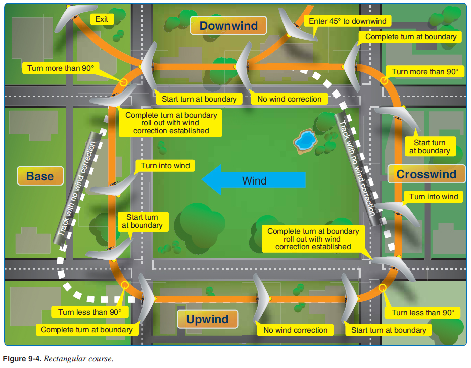 As for other ground track maneuvers, one of the objectives is to develop division of attention between the fl ightpath and ground references while controlling the aircraft and watching for other aircraft in the vicinity. Another objective is to develop recognition of drift toward or away from a line parallel to the intended ground track. This is helpful in recognizing drift toward or away from an airport runway during the various legs of the airport traffi c pattern. For this maneuver, a square or rectangular fi eld (bound on four sides by section lines or roads that are approximately one-half mile in length) should be selected away from other air traffi c. The aircraft should be fl own parallel to and at a uniform distance just to the outside of the fi eld boundaries, not quite above the boundaries so that the fl ightpath may be easily observed from either seat by looking out the side of the aircraft. The closer the track of the aircraft is to the fi eld boundaries, the steeper the bank necessary at the turning points. The distance of the ground track from the edges of the fi eld should be the same regardless of whether the course is fl own to the left or right. Turns should be started when the aircraft is abeam the corner of the fi eld boundaries, and the bank normally should not exceed 45°. These should be the determining factors in establishing the distance from the boundaries for performing the maneuver. Although the rectangular course may be entered from any direction, this discussion assumes entry on a downwind. On the downwind leg, the wind is a tailwind and results in increased groundspeed. Consequently, the turn onto the next leg is entered with a fairly fast rate of roll-in with relatively steep bank. As the turn progresses, the bank angle is reduced gradually because the tailwind component is diminishing, resulting in a decreasing groundspeed. During and after the turn onto this leg (the equivalent of the base leg in a traffi c pattern), the wind tends to drift the aircraft away from the fi eld boundary. To compensate for the drift, the amount of turn is more than 90°. The rollout from this turn must be such that as the wings become level, the aircraft is turned slightly toward the fi eld and into the wind to correct for drift. The aircraft should again be the same distance from the fi eld boundary and at the same altitude as on other legs. The base leg should be continued until the upwind leg boundary is being approached. Once more, the pilot should anticipate drift and turning radius. Since drift correction was held on the base leg, it is necessary to turn less than 90° to align the aircraft parallel to the upwind leg boundary. This turn should be started with a medium bank angle with a gradual reduction to a shallow bank as the turn progresses. The rollout should be timed to assure paralleling the boundary of the fi eld as the wings become level. [Figure 9-5]