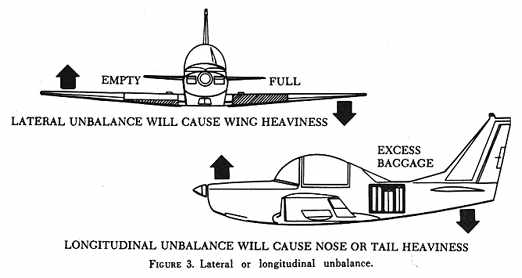 The c.g. is not necessarily a fixed point; its location depends on the distribution of items loaded in the aircraft. As variable load items are shifted or expended, there is a resultant shift in c.g. location. The pilot should realize that if the mass center of an aircraft is displaced too far forward on the longitudinal axis, a nose-heavy condition will result. Conversely, if the mass center is displaced too far aft on the longitudinal axis, a tail-heavy condition will result (fig. 3). It is possible that an unfavorable location of the c.g. could produce such an unstable condition that the pilot could lose control of the aircraft. In any event, flying an aircraft which is out of balance, either in a tail-heavy or a nose-heavy direction, may produce increased pilot fatigue with obvious effects on the safety and efficiency of flight. The pilot's natural correction for longitudinal unbalance is a change of trim to remove the excessive control pressure. However, excessive trim has the effect of reducing primary control travel in the direction the trim is applied.