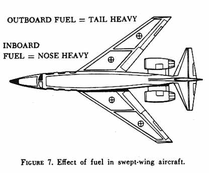 Fuel in outboard tanks has a tendency to rotate the aircraft in a tail-heavy direction and fuel in inboard tanks adds to a nose-heavy condition (fig. 7). The use of fuel from swept wing tanks must be carefully managed to keep c.g. under control.
