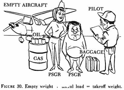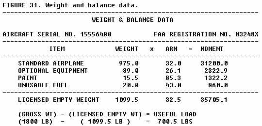 Be sure to follow your aircraft's weight and balance restrictions. The loading conditions and empty weight of your particular aircraft (fig. 31) may differ from those in the owner's manual due to modifications or equipment changes. Sample loading problems in the owner's manual are intended for guidance only; each aircraft must be treated separately for weight and balance. The pilot should understand that although the aircraft is certified for a specified maximum gross weight, it will not safely take off with this load under all conditions. Conditions which affect takeoff and climb performance such as high elevations, high temperatures, and high humidity (high density altitudes), may require operation at reduced weight. Other factors to consider are runway length, runway surface, runway slope, surface wind, and the presence of obstacles. Pilot experience and proficiency should always be considered - if in doubt, reduce the load.