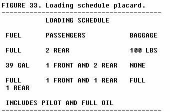 Most aircraft, however, can be loaded in a manner which will place the c.g. beyond limits. Even though the useful load is not exceeded, an out-of-balance condition is serious from a stability and control standpoint. The pilot can quickly determine if the load is within limits, if the aircraft is simple enough to make use of a loading schedule. This schedule may be found in the weight and balance report, the aircraft log book, the owner's manual, or may be posted in the form of a placard. A typical placard may appear similar to the one shown in figure 33.