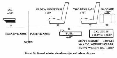 Assume you are a pilot planning a flight in a light single engine, four place aircraft. Your load consists of yourself, one front seat passenger and two rear seat passengers, full fuel and oil, and 60 lb. of baggage (fig. 34). Here is how the critical weight and balance problems are solved for this case by two different methods (examples 23 and 24).