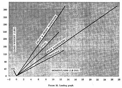 Weight and balance computations are greatly simplified by two graphic aids - the loading graph and the center of gravity moment envelope. The loading graph (fig. 35) is typical of those found in general aviation aircraft owner's manuals. This graph, in effect, multiplies weight by arm giving moment, then divides the moment by a reduction factor, giving an index number. Weight values appear along the left side of the graph. The moment/1,000 or index numbers are along the bottom. In this example, each line representing a load item is labeled. To determine the moment of any load item, find the weight along the left margin, then project a line right to a point of intersection with the appropriate load item line. For example, the index number of a pilot weighing 170 lb. is 6.1.