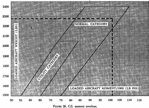 The c.g. moment envelope (fig. 36) allows the pilot to bypass the computation of a c.g. number. It gives an acceptable range of index numbers for any aircraft weight from minimum to maximum.