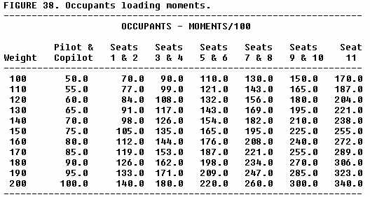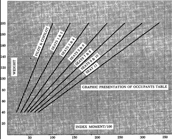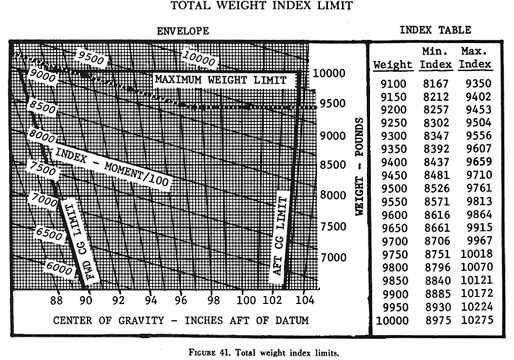 One typical weight and balance control system for high density seating aircraft is based upon the utilization of useful load index tables and a total weight index limit envelope or table. With these tables (figs. 38, 39, 40, 41), it is possible to determine if weight and balance is within limits even in a situation where the passenger, cargo, or fuel loads change fairly rapidly. The tables can be read for intermediate weights by interpolation of values. To simplify and speed up calculations, use the nearest listed weight, but be conservative when checking against particular limits. The system is generally similar to those discussed on smaller aircraft. The pilot adds the weight and moments (index) of the empty aircraft and the useful load items. Then, checks are made against the published limits in this case the index limit envelope or table. Care must be taken to use the empty weight and moments or index from the latest weight and balance report. The pilot must be sure to use the same reduction factor for all moments in the calculations. Sufficient accuracy is obtained by rounding off index numbers to the nearest tenth.