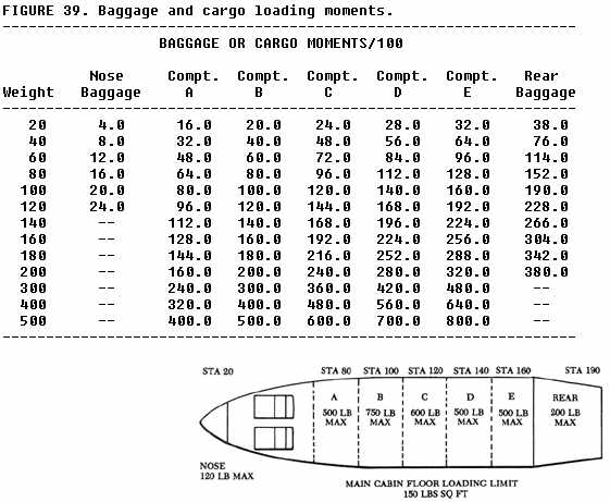 1. Select the cargo weight which would make a difference of at least 20.7 index units when compartments A and E are compared. (40 lb. = 64.0 - 32.0 = 32.0 index units)