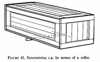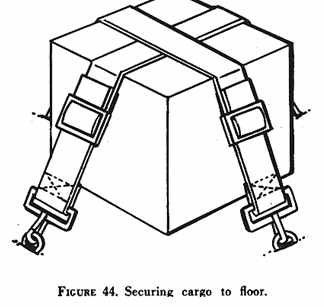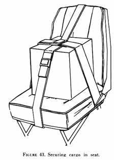 Cargo may be secured by means of tiedown devices such as straps, ropes, or nets. These devices, when properly used, will restrain the cargo from moving in any direction. Tiedown fittings should be adequate in number and strength to restrain a cargo of any allowable weight and size. Floor structure, particularly where the tiedown fittings are anchored, must be strong enough to resist any anticipated load without distortion. Cargo floor loading limits are usually expressed as maximum weight in pounds per square foot. If a cargo item is loaded in a seat, the pilot would be wise to limit its weight to that of an average passenger. A tiedown or safety belt should restrain its movement in the seat (fig. 43). A single cargo item on the cabin floor should be secured in a manner similar to that shown in figure 44. Its center of gravity may be determined by the method shown in figure 45. The following general precautions should be observed when actually loading the cargo: