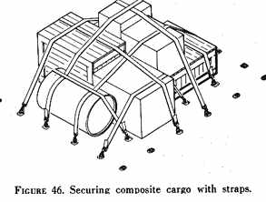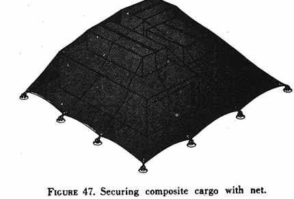 Many cargo loads carried in air taxi aircraft will consist of a variety of boxes, crates, sacks, drums, etc. This type of composite cargo may be secured with the type devices shown in figures 46 and 47. Sufficient restraint should be used to prevent shifting because of high deck angle or inertia forces. In arranging composite loads, cargo items should not be arranged so the load is top-heavy. If possible, the height of the load should not exceed its length. Particular care should be taken to secure this type load against slipping out from under the tiedown device. If the individual items of this type cargo are comparatively light, a net type tiedown device is adequate. Heavy items will require ropes or straps.