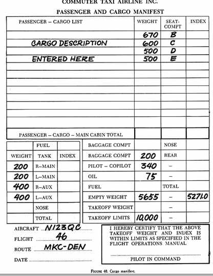 This problem is an example of the use of a manifest form to determine the weight and balance condition of a cargo flight. The airplane is the same one used in example 25 with the seats removed from the main cabin. Notice that the empty weight and moments have been changed due to the removal of the seats. This change must be carefully noted according to the manufacturer's recommendations. The sample manifest form in figure 48 has been completed to show the useful load and empty weight items.