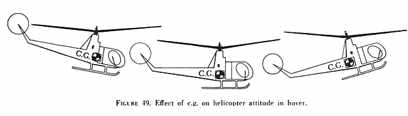 Most helicopters have a much more restricted c.g. range than do airplanes. In some cases this range is less than 3 inches. The exact location and length of the c.g. range is specified for each helicopter and usually extends a short distance fore and aft of the main rotor mast or the centroid of a dual rotor system. Ideally, the helicopter should have such perfect balance that the fuselage remains horizontal while in a hover and the only cyclic adjustment required should be that made necessary by the wind. The fuselage acts as a pendulum suspended from the rotor. Any change in the c.g. changes the angle at which it hangs from this point of support. Many recently designed helicopters have loading compartments and fuel tanks located at or near the balance point. If the helicopter is not loaded properly and the c.g. is not very near the balance point, the fuselage does not hang horizontal in a hover. If the c.g. is too far aft, the nose tilts up and excessive forward cyclic is required to maintain a stationary hover. Conversely, if the c.g. is too far forward, the nose tilts down and excessive aft cyclic is required (fig. 49). In extreme out-of-balance conditions, full fore or aft cyclic may be insufficient to maintain control. Similar lateral balance problems may be encountered if external loads are carried.